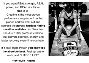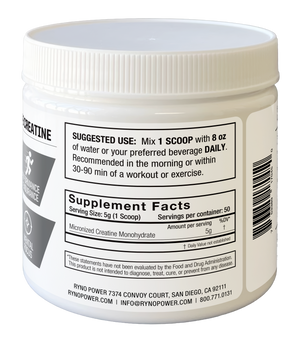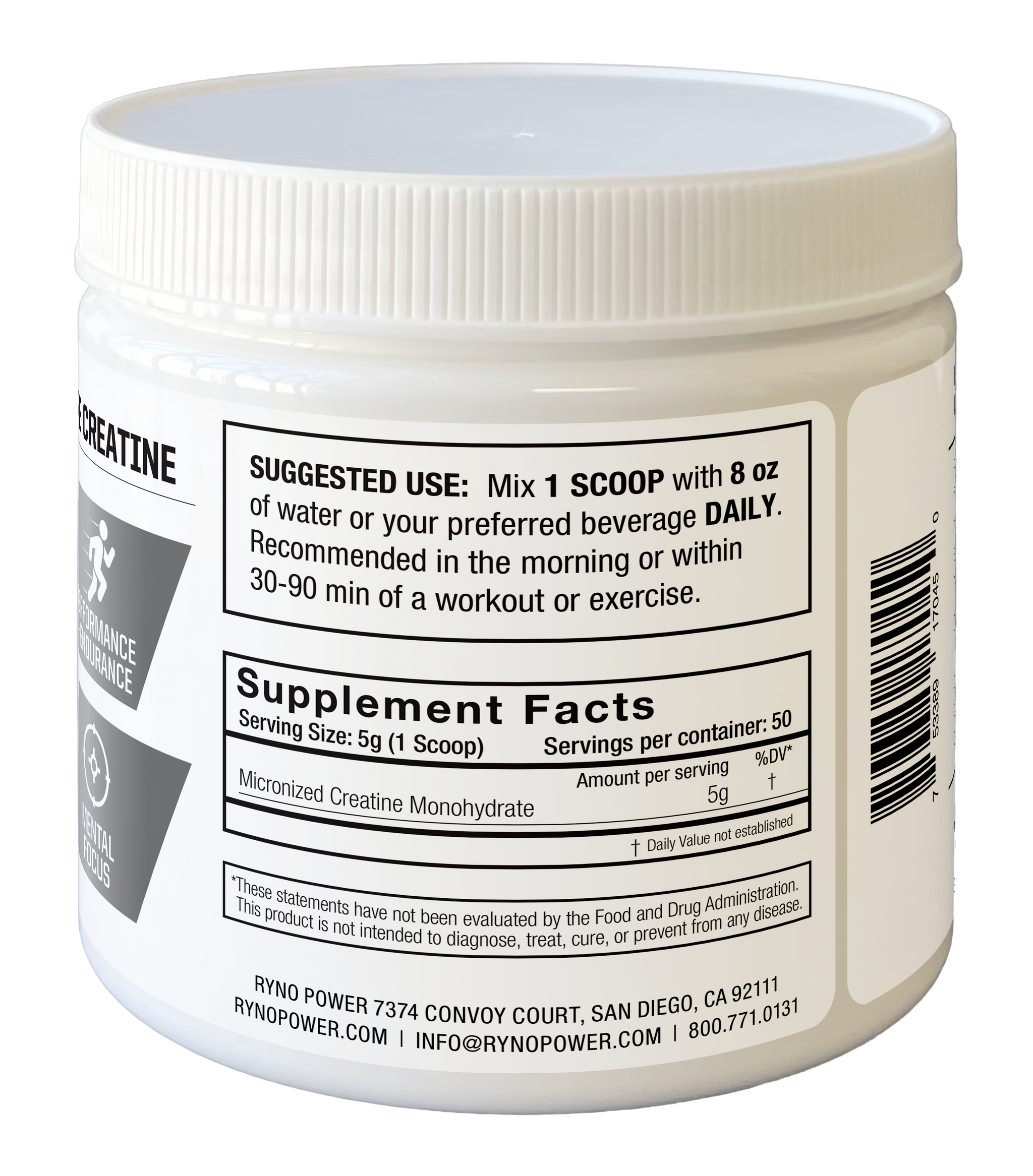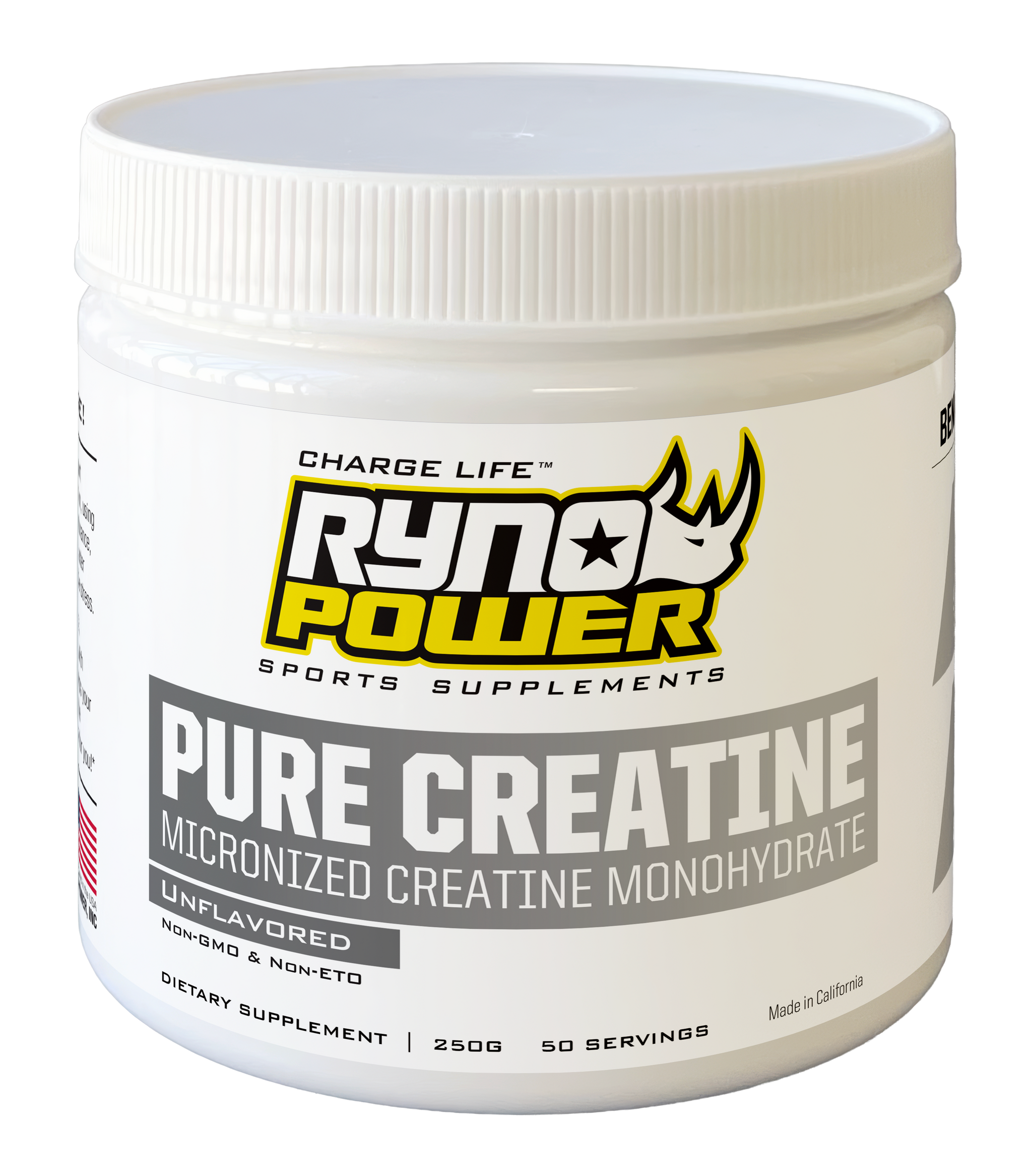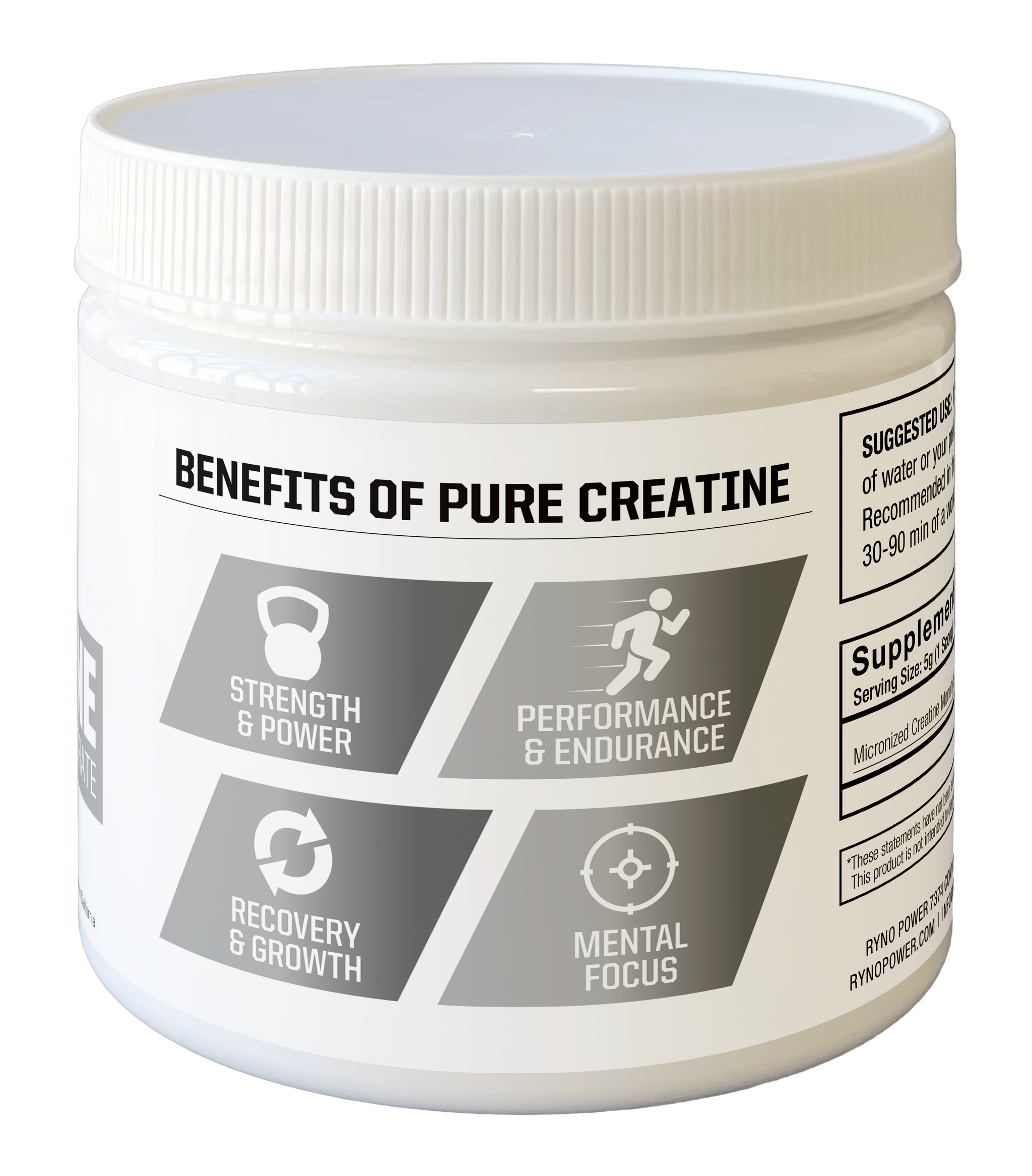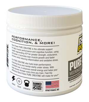 Ryno Power PURE Creatine is the ultimate support for daily muscle performance and cognitive function, using rapidly regenerating ATP for greater strength, endurance, and power. It promotes lean muscle growth and faster recovery while reducing inflammation and oxidative stress. Our PURE Creatine also fuels brain performance, improving focus and mental clarity under stress. With consistent use, it enhances overall energy and helps your body recover stronger every time you train.  Feel the difference Ryno Power PURE Creatine will make for you!