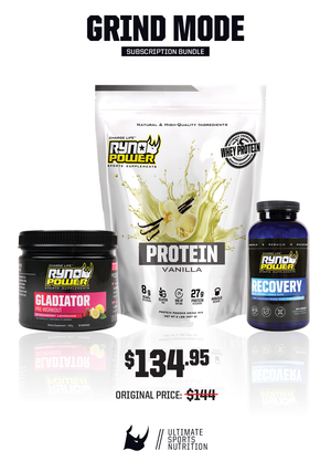 The Grind Mode Bundle is built for those who train hard and never let up. It includes Protein Powder to support muscle growth and recovery, Recovery capsules to reduce soreness and speed up repair, and Gladiator for explosive pre-workout energy with added endurance support.